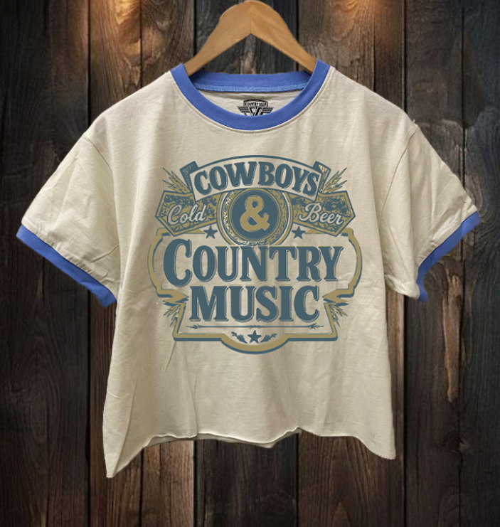 Cowboy, Cold Beer, and Country Music ringer Cropped T- shirt available in natural color